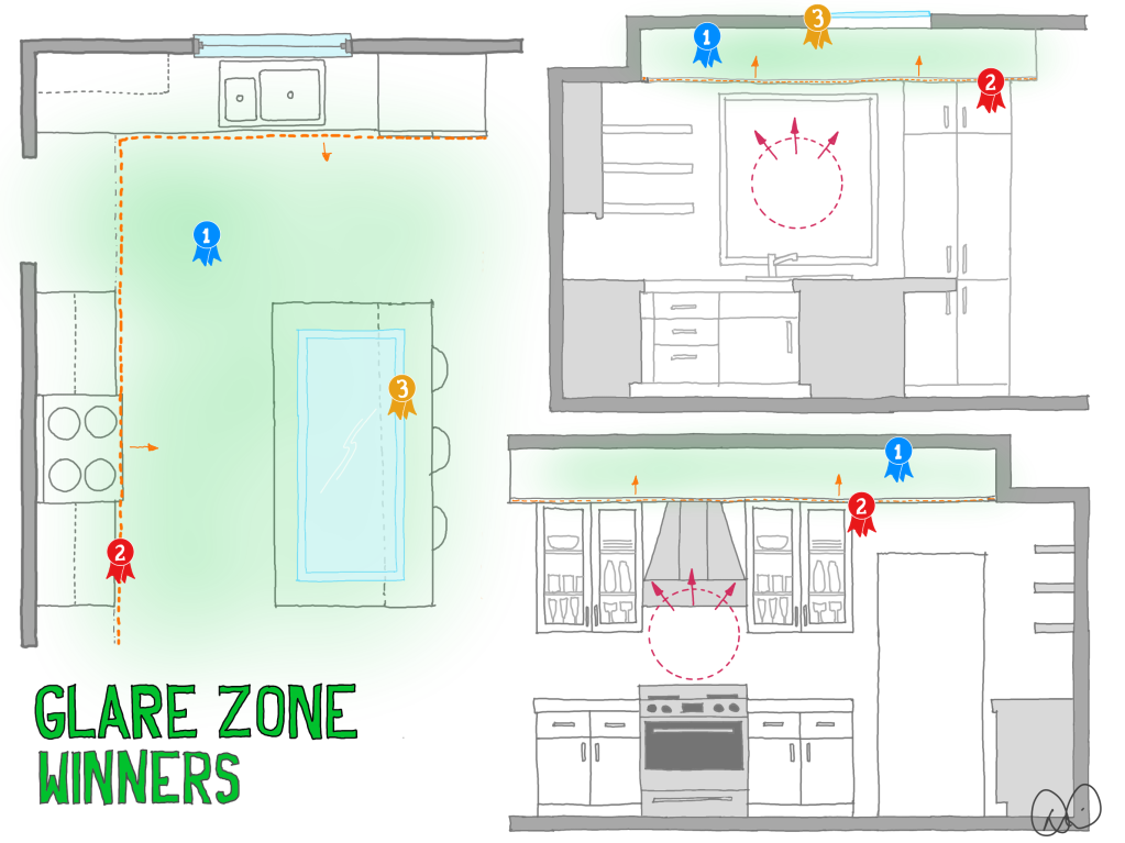 Linear LED strips are incredible tools for indirect lighting, taking up a fraction of the space of previous solutions, costing far less, lasting far longer, and using much less energy. If you have a soffit around the perimeter of the kitchen, as shown in the sketch above, a simple horizontal wood trim piece can provide a mounting location for linear LED strips facing upwards. No soffit? Placing the strips directly on top of upper cabinets or upper shelves for a similar effect. The inside of tray ceilings can deliver the same glare-free light in the Glare Zone. Note how we are obeying the optimal directions rule discussed in the first post of the series: light in the Glare Zone is pointed away from our eyes.