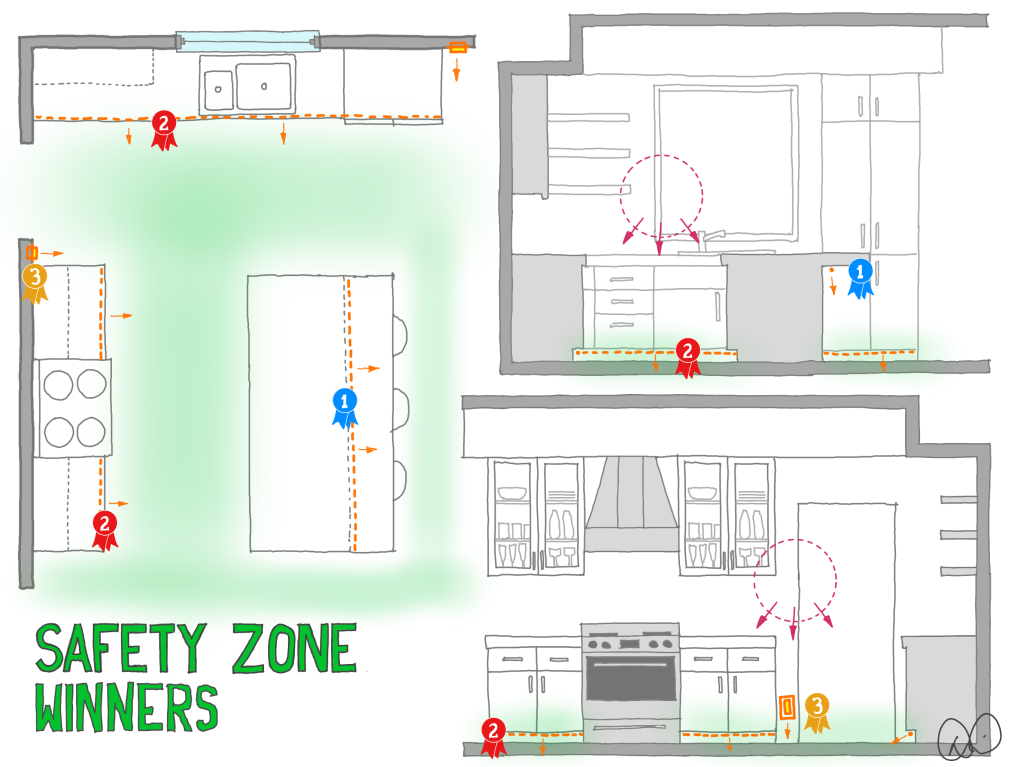 With fixtures placed in the Work, Comfort, and Glare Zones, we can now address the final area of our kitchen: the Safety Zone. We need light to walk around our kitchens at night, but usually we do not need to flood the entire kitchen just to get a drink of water. Instead, carefully placed light in the Safety Zone can make our movement safer while adding a healthy dash of relaxing comfort to our homes.