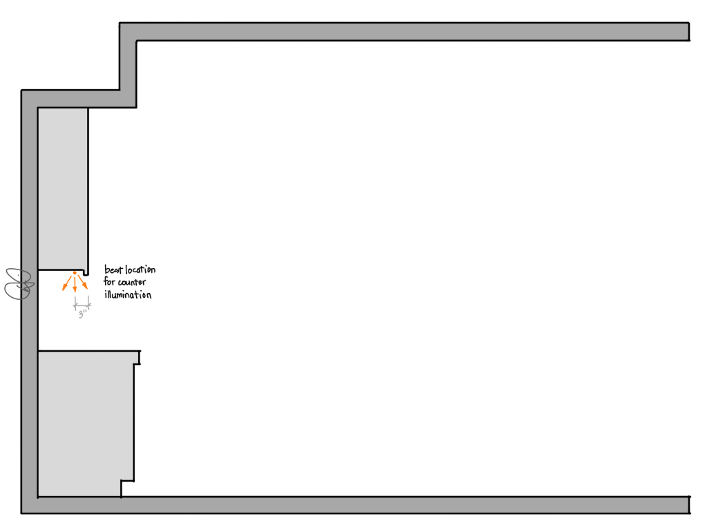 Undercabinet lighting won First Place in the Work Zone, though exact placement is hotly contested. You can deep dive HERE and in multiple other posts on the blog but consider this illustration the executive summary. If you want your countertops (the Work Zone) well lit, I recommend placing linear LED strips about 3” back from the face of the upper cabinets, pointed directly downwards towards the counter.