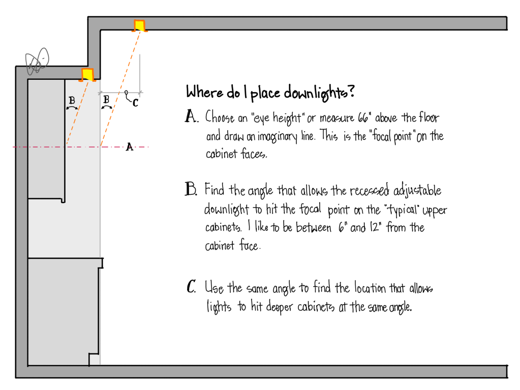 Looking at one of our typical kitchen lighting plans can lead to confusion when you notice that our recessed adjustable downlights seem to dance around the ceiling in random patterns. In other words, recessed lighting in a professionally designed kitchen will almost never be in straight lines…at least not the straight lines we can see at first glance.