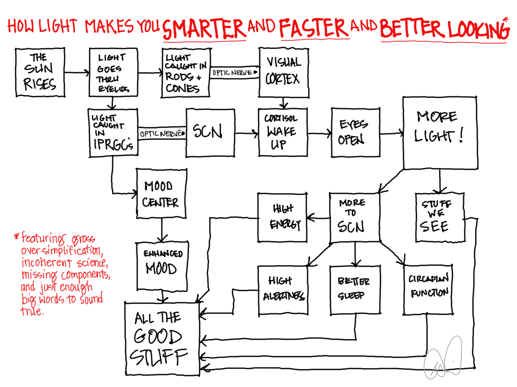 Our Natural Clock is a complicated mechanism. The un-scientific chart above is simply intended to illustrate that light and its impact on our daily routines are wrapped together in countless biological subroutines that interact minute by minute, ultimately delivering impact on our Natural Clock and all its functions, like mental sharpness.