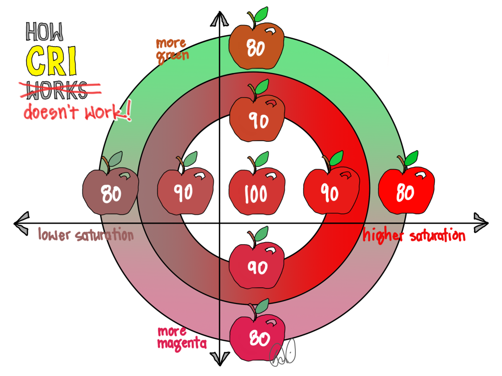 Hue might also be shifted by different light sources, causing the apples to look a little greener or a little more magenta. So which CRI is best? 100, right?