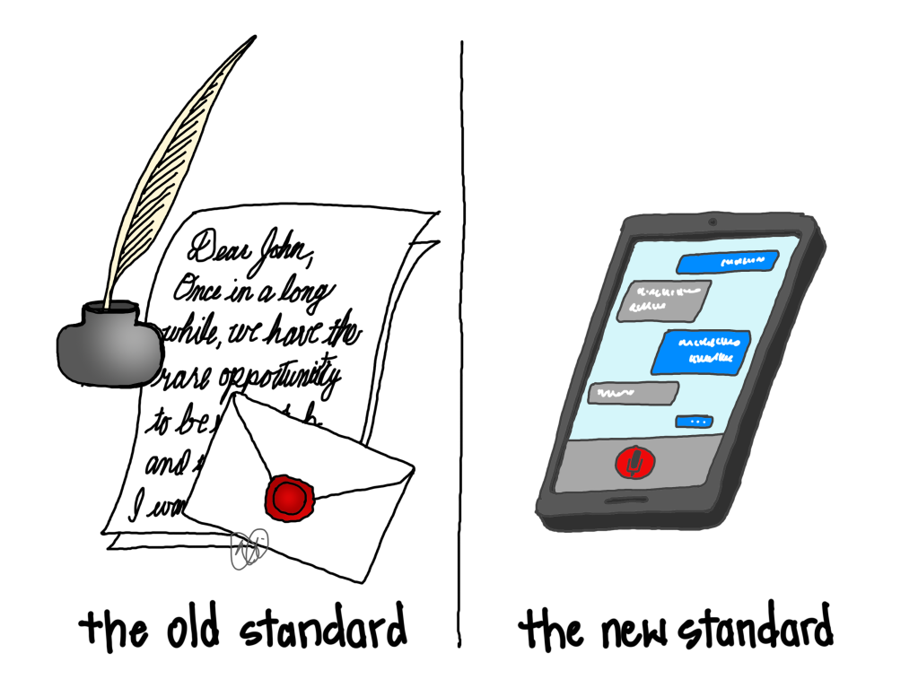 Paper and quill, perhaps with a wax-sealed envelope and the Pony Express, set the standard for quick-yet-personalized messages ages ago, but the new standard gets our messages across the globe at speeds unconceivable when horses at gallop meant “fast.” There was nothing wrong with handwriting a letter and perhaps there is still some nostalgia for it but send me a text if you want a response today. Within minutes.