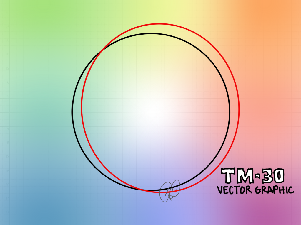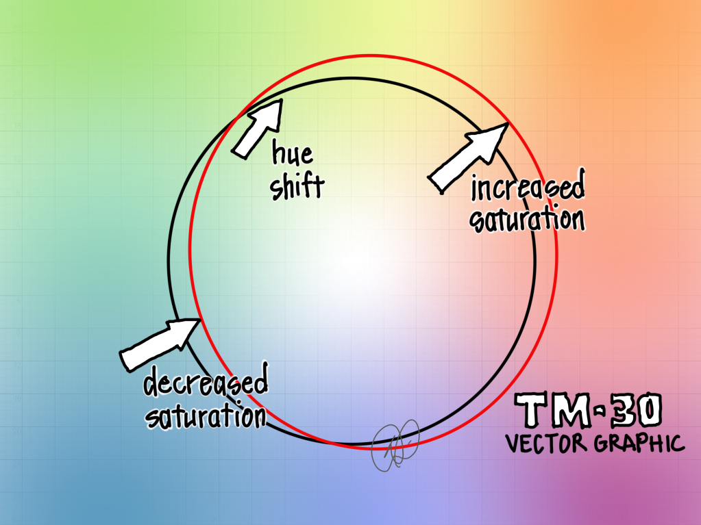 I am a visual learner: if I see it, I learn it. TM-30’s Color Vector Graphic, which looks something like the sketch above, is a visual representation of a light source (the red line) when measured against a standard (the black line).