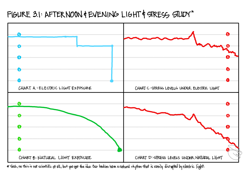 Chart B, on the other hand, shows what I experience when I go camping and what our ancestors experienced every single day, all year long, for their entire lives. Light was bright at noon and then gradually, gently, inevitably grew dimmer and darker until stars appeared in the night sky. This natural light, combined with the warm dancing light of a fire, caused our bodies to produce sleep hormones and occupied our brain in a calming fashion.
