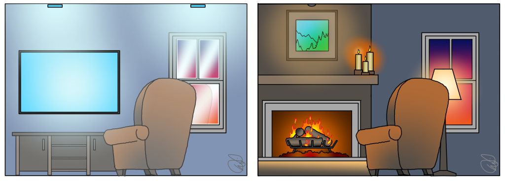 This could be our indoor lighting, too. Dimming it down is a big start; warming up the color temperature (I find that 2200°K is a nice feel for me) gets us closer. Then turning off nearly all of the overhead light (with the possible exception of lights aimed at artwork) will get us a much more relaxing vibe. Candles and real fires help, but they are not necessarily practical.