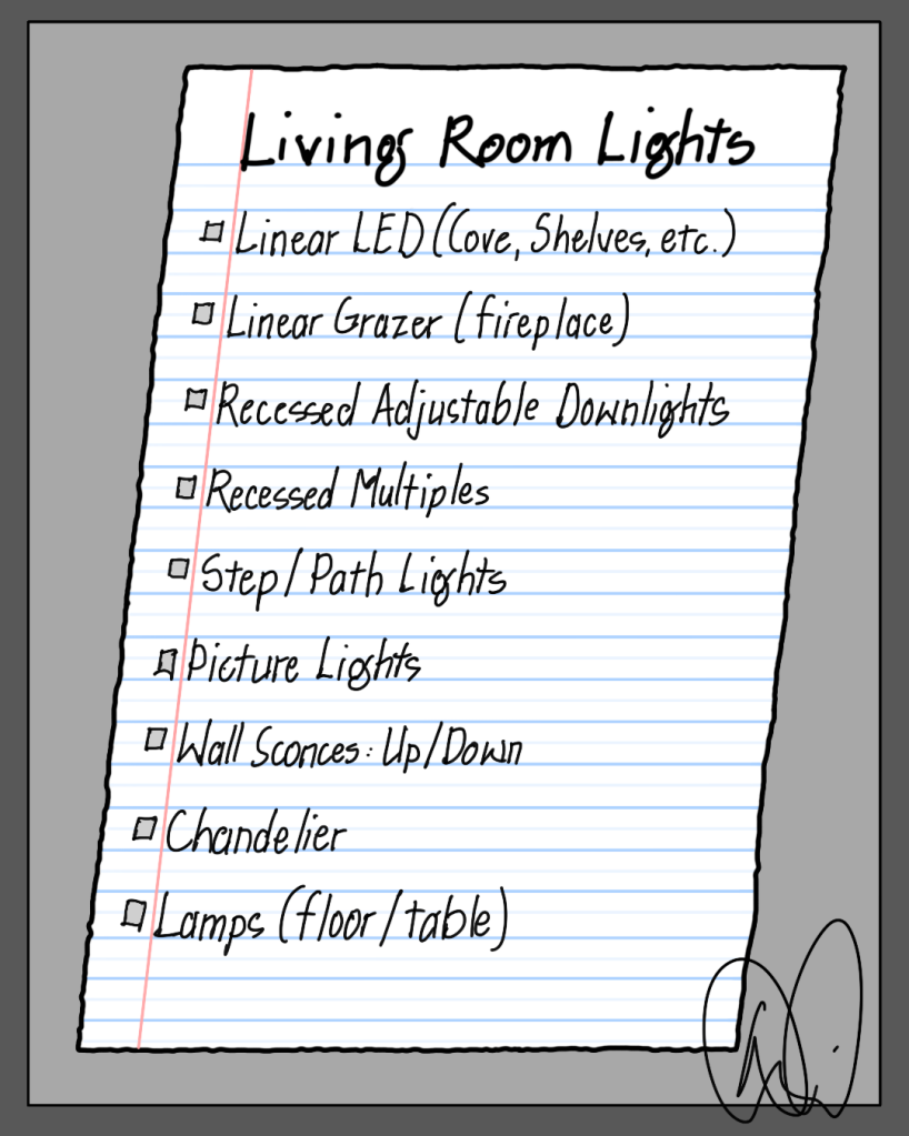 Before we dig in, I have two disclaimers to make. First, after thirty years of lighting design, I have a head full of products and this process is usually pretty quick. In other words, don’t be intimidated if this is your first try: it will get easier in time. Secondly, I am keeping it rather generic in this series. Why? Because avoiding specific brands and product numbers allows this advice to last longer. Sure, I could give you an ordering code for a particular warm-dim high-output linear LED “tape,” channel, lens, and driver…but by the time you read this, there will likely be a better product on the market.