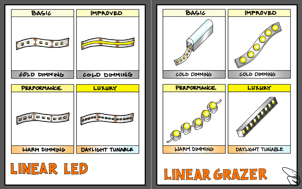 COB, or chip-on-board, strips are increasingly popular and many offer short cut lengths that allow for increased precision. The continuous strip of phosphor covering the tightly-spaced, tiny LED chips all but eliminates dotting and leads to smooth lighting in even the tightest of applications. I categorize them as “Improved” when in fixed color temperature, but there are an increasing number of color-changing, tunable, and even warm-dimming COB strips available. I suspect most linear will be COB in the next couple of years.