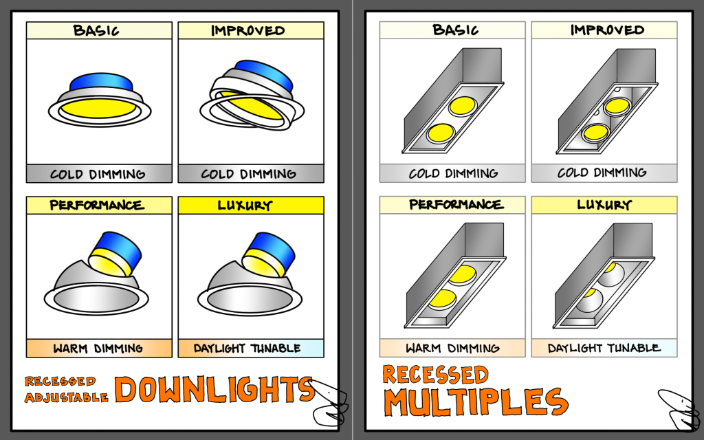 Basic multiples allow for adjustability, often using gimbal-style rotation mechanisms, and are available in fixed color temperatures for “cold dimming.” These may have higher glare than some of their cousins.
