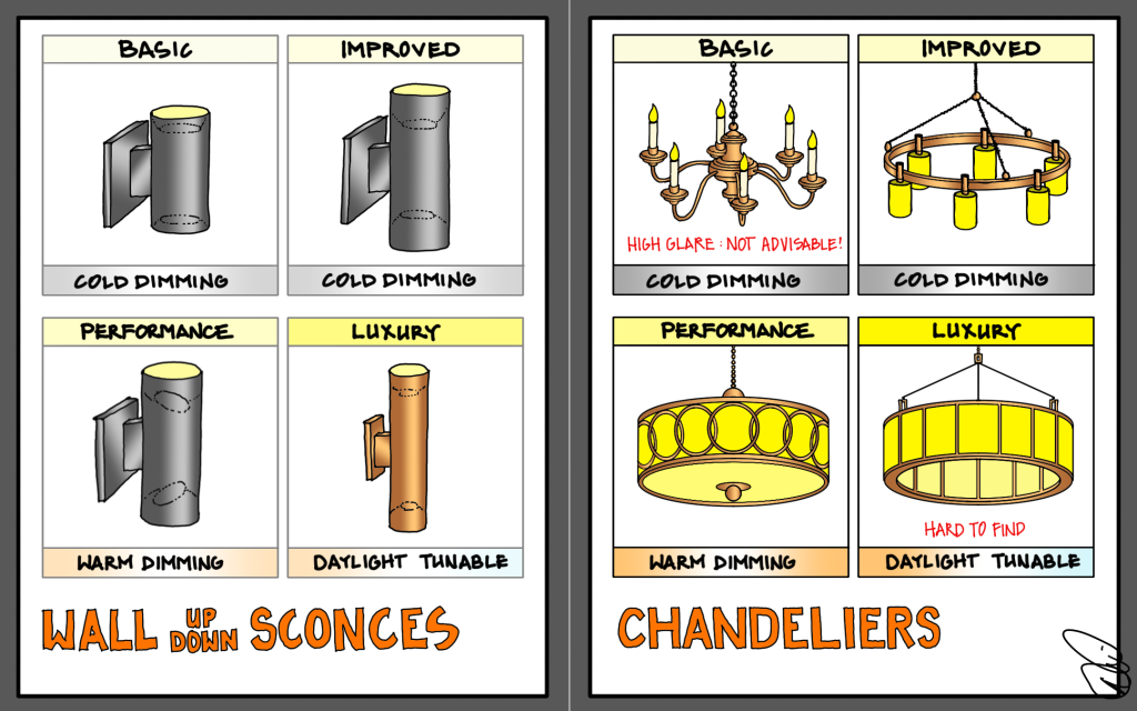 Performance chandeliers are few and far between; there just isn’t much demand for something that looks great and delivers usable, low-glare light into a room. Sadly. If you are looking to upgrade, however, there are a few options. First, look for warm-dimming technology or purchase warm-dimming LED bulbs to soften and warm up the light. Secondly, look for fixtures that hide the light sources and spread the light over large diffusers or shades. This softens the distribution of light, all but eliminating glare.