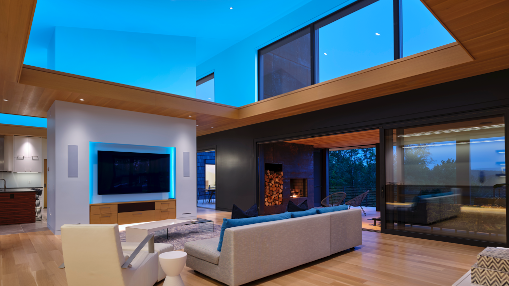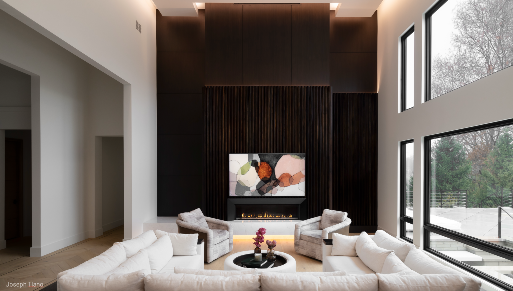 Light in this space is very muted by the daylight flooding in, but you can just make out a linear glow above and to the right of the fireplace where the fluted material steps back to dark wooden panels. This approach helps the interior design treatment look its best while introducing indirect light into the space.
