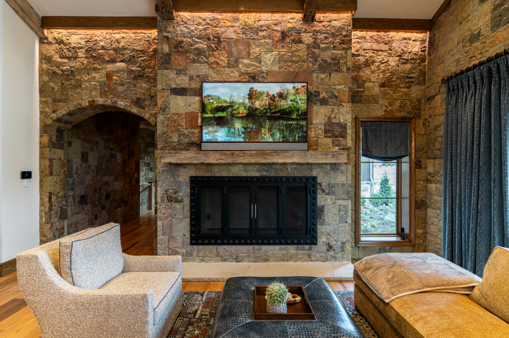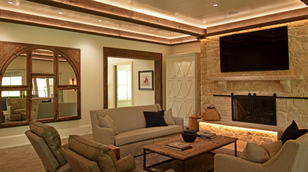 A sure-fire way to spark creativity while making trade partners happy: light the important stuff in the room. Here, the beautiful stone work has light grazing downwards from a shielding wooden valance. The result is a soft glow that calls our attention to the rough stone. The homeowners invested real money in the stone, why not highlight it?