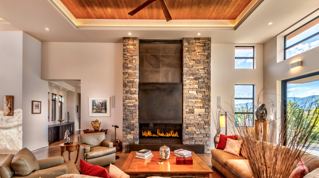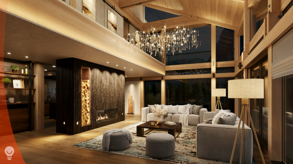 There is no end to opportunities, and we packed a good number of them into this rendering. Notice the up/down sconces on the wooden columns, the light below the coffee table, step/path lights, highlights in the firewood storage, and linear along the bottom of the long wooden beam that holds up the balcony. How many different lighting “layers” can you count in this photo? I count 15.