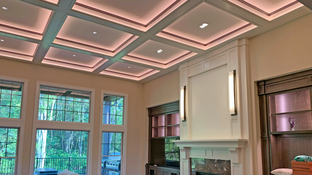 Coffered ceilings can be quite stunning when illuminated. This is costly and time-consuming to install, but nothing calls attention to detail like light. These coffers will also fill the entire room with soft, glare-free light, reducing the reliance on the recessed downlights and increasing comfort.