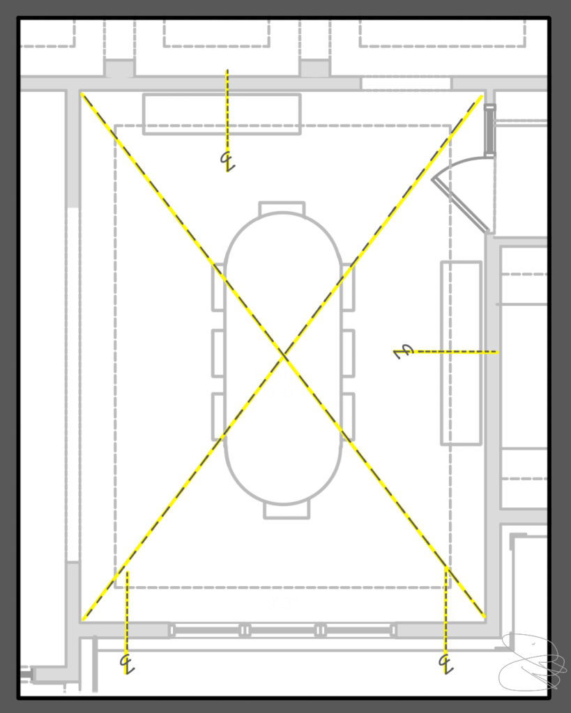 Staring at a blank plan can be intimidating, but for me the first step is always an easy one: I mark the centerlines that will guide later placement. In a dining room, a simple “x” through the room, from corner to corner, will easily and accurately locate the center of a rectangular room. There are, of course, exceptions, but in most cases, this is where the dining room table will be and where any lighting for the table should orient.