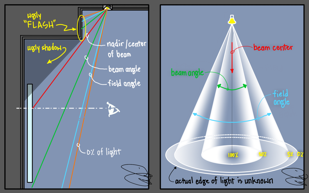 This gets a little technical, but it can be helpful to understand the meaning of beam angle and field angle, both technical measurements of the beam of light emitted from a light fixture. In simple terms, as shown in the diagram on the right above, the beam angle is the area of the beam that goes from the brightest output to 50% of said bright spot. The beamangle is what is typically given by manufacturers, so you might see a recessed light that says something like “36° Beam Angle.” As you can see in the diagram, however, beam angle is just the beginning.