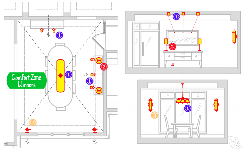 You may note that I have two recessed adjustable downlights above one sideboard and three above another. There are a couple of ways to make this decision. First, you can develop spacing rules-of-thumb. In this case, a spacing of about 24”-30” means the lights will overlap each other a bit leading to nice, even illumination of the artwork. Secondly, if you know the exact art piece, you can do a little math and geometry to determine the best lighting configuration. For the sideboard on the right, where the largest piece of art in the room is likely to live, I assumed a need to cover more of the wall and went with three fixtures. Oh…hold up on that for a sec….