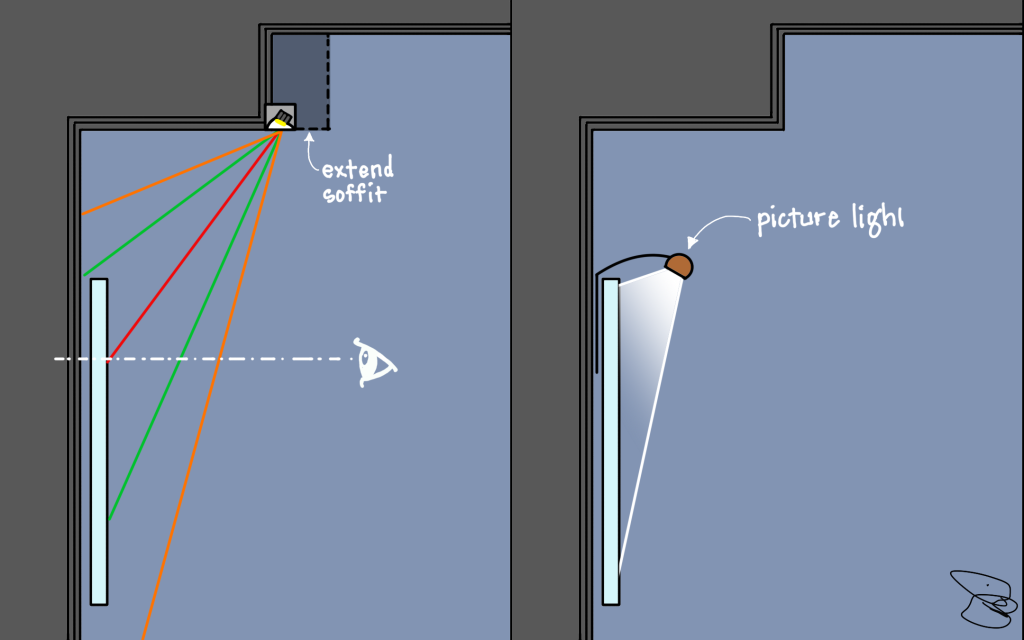 The diagram on the left shows the situation I just created in section view, with a downlight on the upper ceiling and art hanging on the wall below the soffit created by a tray ceiling. When properly aimed at the art, with the hotspot somewhere around eye height, note how both the beam and the field angle – and the remaining bit of light beyond the field angle – smack into the face of the soffit. Because the soffit face is so close to the light, it will be extremely brightly illuminated by an ugly flash of light, distracting at best.
