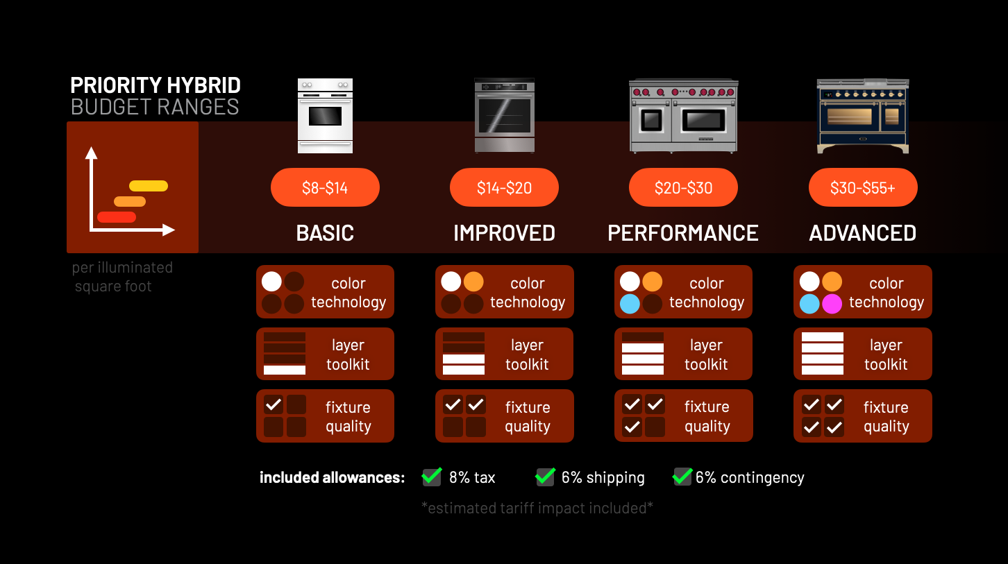 Please keep in mind that these ranges are a hybrid or blend of the entire home. For example, you're kitchen might be in the Advanced category, but your garage might be in the Basic category, which could result in the overall budget landing in the Performance category. And don't forget that we've also included tax, shipping, & contingencies in these ranges too for your convenience.